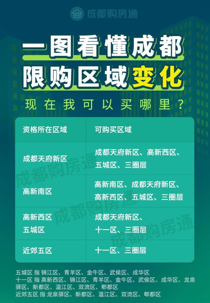 目前成都购房资格主要是看户口、看社保和看户口+社保。即如果要购买成都一二圈层的房子,你需要满足该区域2年户口、2年社保或同一限购区户口(落户即可)+连续1年公司社保,任意一项;三圈层只需满足成都户口就可购买。